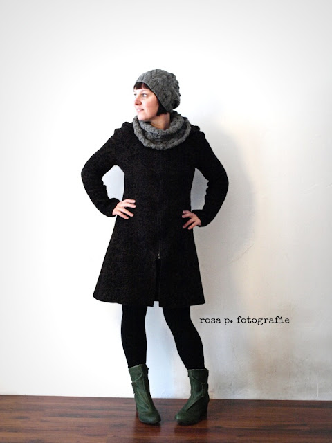 und die oberste schicht: ein wolliger mantel mit kapuze aus besticktem woll walk. und eine alpaca muetze samt passendem loop.