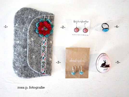 | -1- filz taeschchen von der kleinigkeitenkraemerei, -2- ohr ringe von glueck & glunker, -3- amazorit ohrringe vom schmetterlings lachen, -4- ring von strawberry hill, -5- osterei: ein geschenk von der gross stadt heidi. |