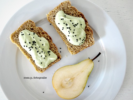 wir haben es heute morgen ziemlich eilig mit avocado creme [ bestreut mit schwarz kuemmel] und einer birne gegessen.